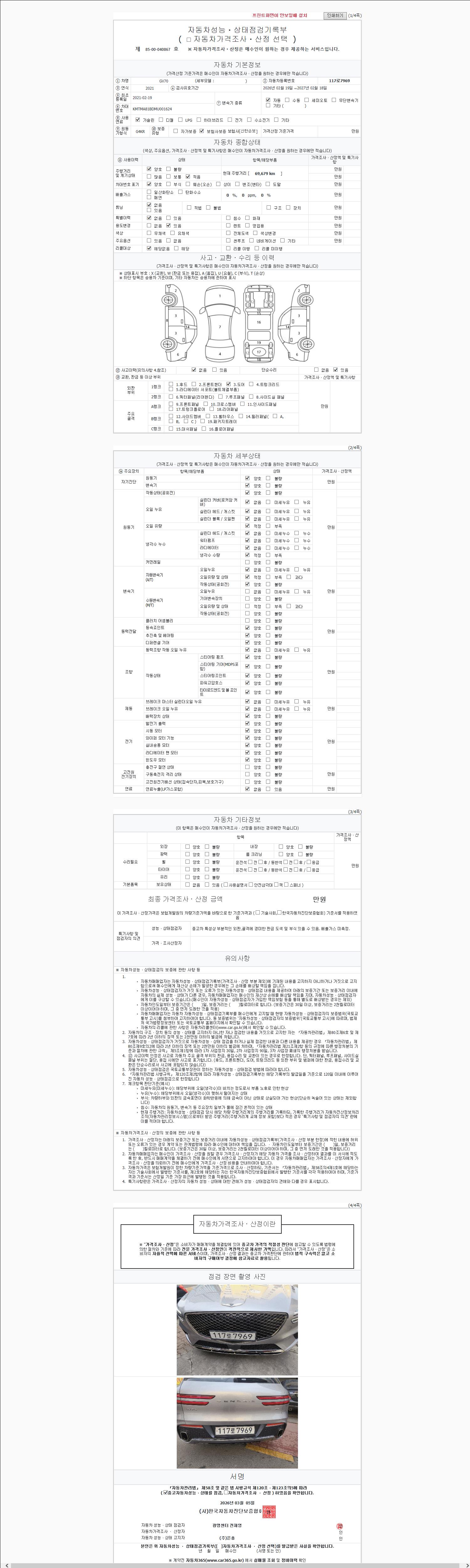 | 주행거리 | 69,583 km | 차량번호 | 117로7969 | 사고유무 | 성능기록부 참조 | 제시번호 | 제 2147483647 호 |