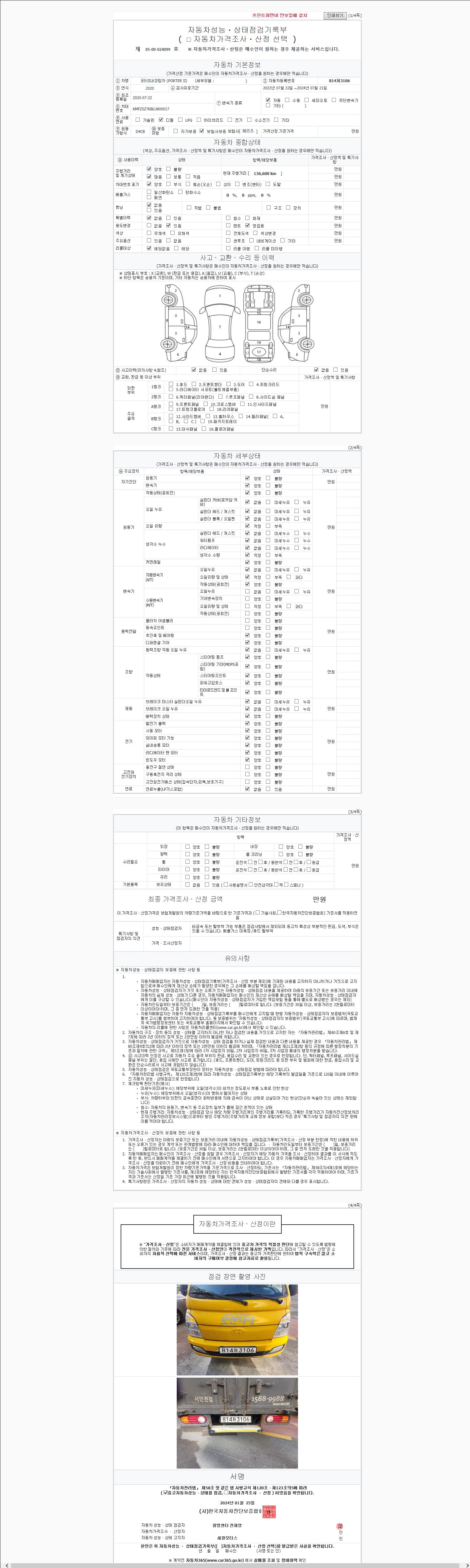 | 주행거리 | 136,600 km | 차량번호 | 814저3106 | 사고유무 | 성능기록부 참조 | 제시번호 | 제 2147483647 호 |