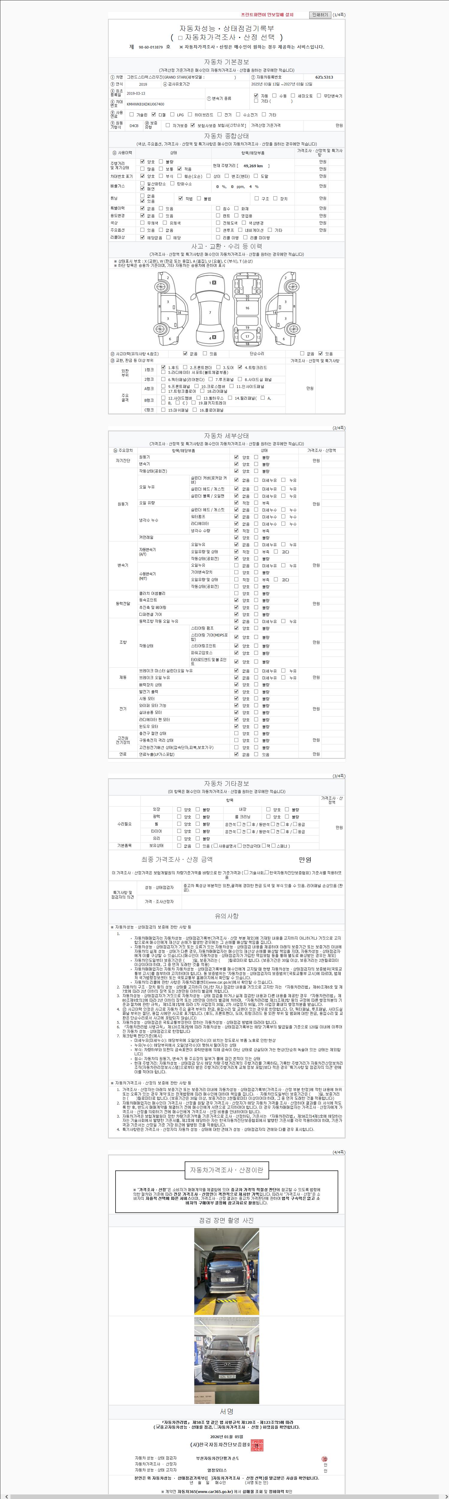 | 주행거리 | 49,190 km | 차량번호 | 62노5313 | 사고유무 | 성능기록부 참조 | 제시번호 | 제 2025239463 호 |