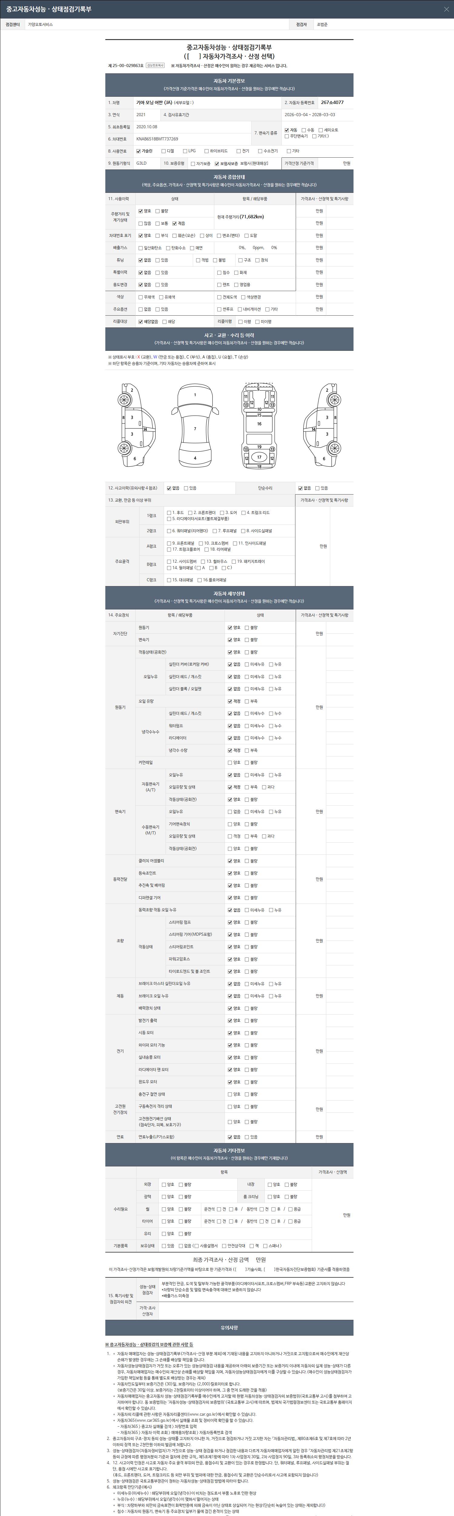 | 주행거리 | 71,682 km | 차량번호 | 267소4077 | 사고유무 | 성능기록부 참조 | 제시번호 | 제 2026036087 호 |
