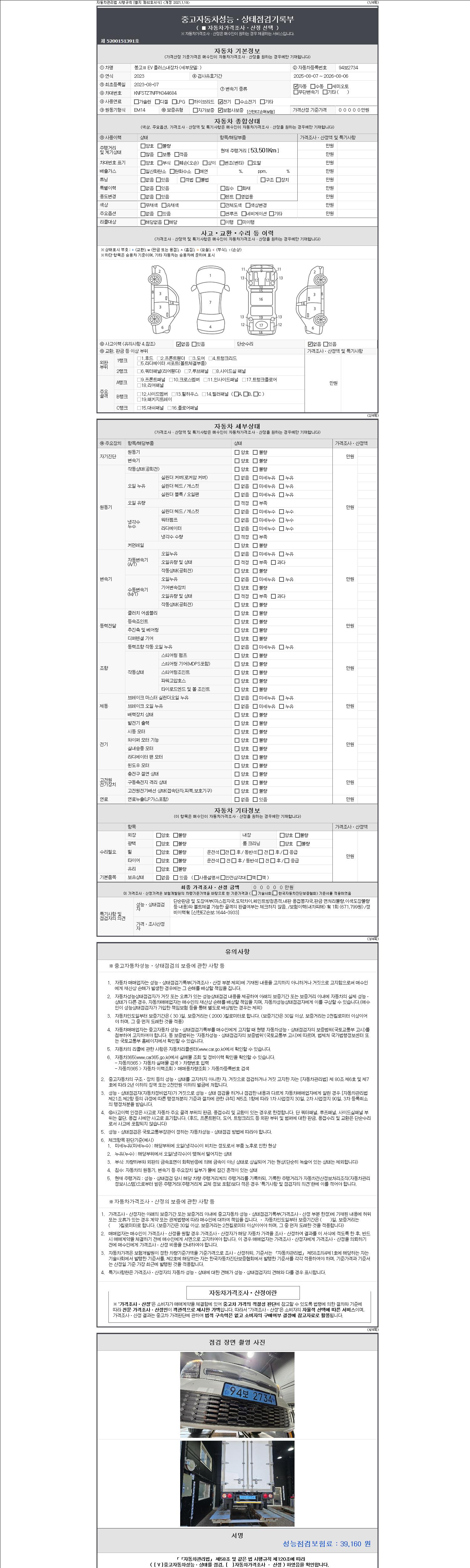 | 주행거리 | 53,501 km | 차량번호 | 94보2734 | 사고유무 | 성능기록부 참조 | 제시번호 | 제 2147483647 호 |